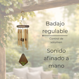 Este producto es un ejemplo de artesanía de alta calidad, que incluye seis tubos sonoros de aluminio parcialmente reciclado con un revestimiento en polvo de alta calidad. Cada tubo está afinado con precisión para un sonido duradero y puede usarse tanto en interiores como en exteriores protegidos. Con posibilidad de silenciar con un simple movimiento.