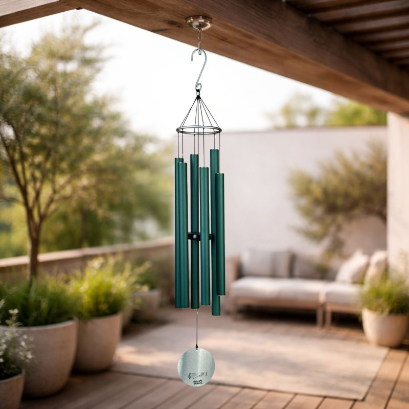 Sus seis tubos están fabricados con un 80% de aluminio reciclado, protegidos por un revestimiento en polvo verde bosque que garantiza resistencia a la intemperie. Cada tubo ha sido afinado a mano y cuenta con paredes gruesas para asegurar una resonancia duradera. Incluye un gancho en "S" y un silenciador ajustable, permitiendo adaptar la intensidad del sonido a tu entorno. Calidad acústica y diseño responsable de NATURE'S MELODY.