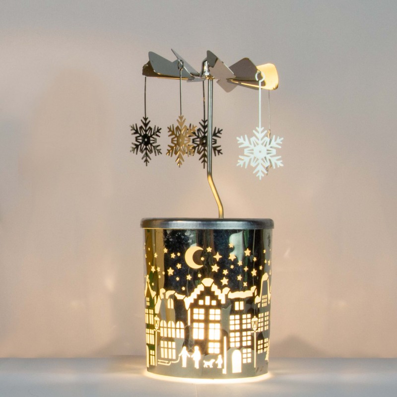 Cuando enciendes la vela (incluida), el calor pone en marcha la hélice, dando vida al carrusel. El resultado: un juego hipnótico de sombras danzantes y reflejos mágicos, que transforma cualquier espacio en un rincón acogedor y lleno de paz. Perfecto para noches tranquilas, momentos de meditación o como toque especial en celebraciones invernales.