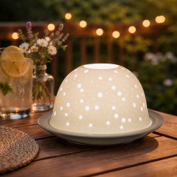 Estos atractivos Dome Lights están hechos de porcelana biscuit con muchos atractivos diseños. Objetos luminosos de porcelana blanca con motivos atractivos de la naturaleza, el arte, los temas modernos y otros motivos estacionales en relieve muy fino, que se iluminan con una vela de té o led muestran su encantador motivo.