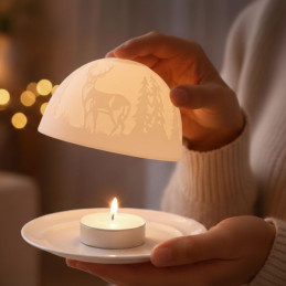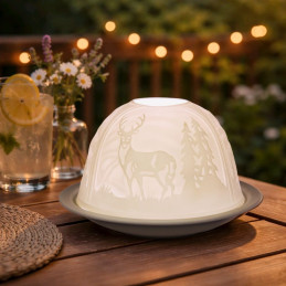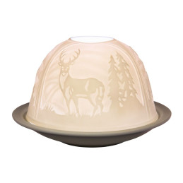 Dome Light Ciervos. Ciervos entre árboles atentos a cualquier cambio en su alrededor. Un Dome Light que nos muestra toda la belleza de estos animales. Los Dome Lights están disponibles con muchos motivos diferentes y por lo tanto son una popular pieza de coleccionista. Encontrarás un motivo adecuado para cada estación, así que puedes llevar una luz acogedora a tu casa o regalar algo especial no sólo en Navidad. Aparte de con una vela de té el Dome Light puede ser utilizado también con una Base Led (Pilas 2 x AA no incluidas), o una base de madera para enchufar. Estos complementos puedes encontrar en la Categoría Accesorios en nuestra tienda.