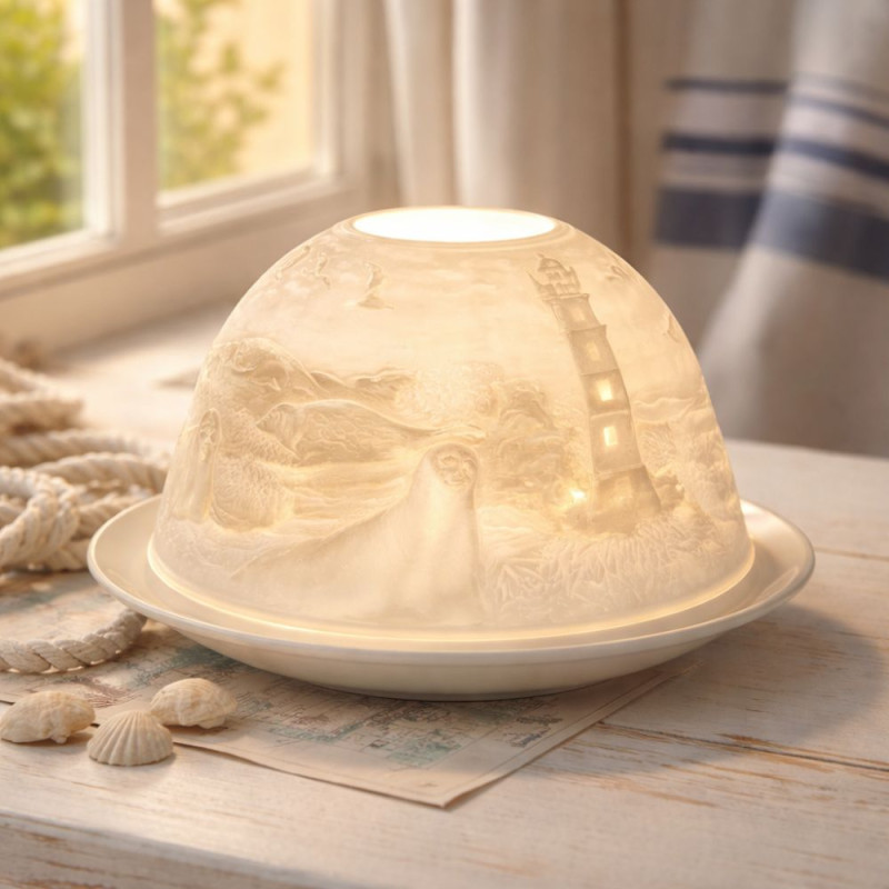 El Dome Light Faro de luz marina es más que un portavelas: es una invitación a detener el tiempo y dejar que la calma del mar te envuelva. Fabricado en porcelana blanca translúcida de alta calidad, está compuesto por dos piezas:
