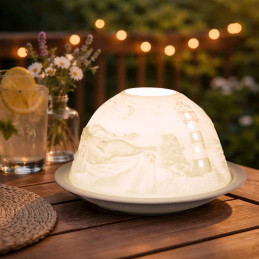 Un portavelas de porcelana blanca con grabado de faro y mar que transforma la luz en calma. Ideal para crear un rincón de serenidad en tu hogar o regalar un instante de paz. Encendemos tu espacio con luz y lo llenamos de corazón.
