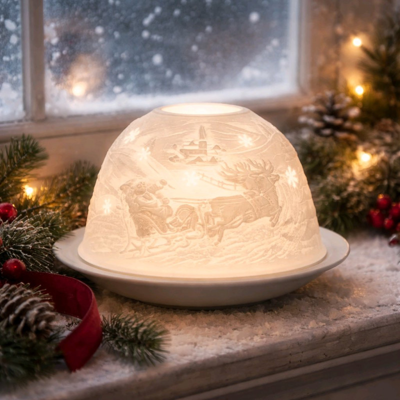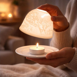 Estos atractivos Dome Lights están hechos de porcelana biscuit con muchos atractivos diseños. Objetos luminosos de porcelana blanca con motivos atractivos de la naturaleza, el arte, los temas modernos y otros motivos estacionales en relieve muy fino, que se iluminan con una vela de té o led muestran su encantador motivo.