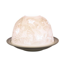 Portavela Dome Light Mariposa con una cúpula calada imaginando un cielo estrellado. Una preciosidad iluminada con una vela de té. Los Dome Lights están disponibles con muchos motivos diferentes y por lo tanto son una popular pieza de coleccionista. Encontrarás un motivo adecuado para cada estación, así que puedes llevar una luz acogedora a tu casa o regalar algo especial no sólo en Navidad. Aparte de una vela de té el Dome Light puede ser utilizado también con una Base Led (Pilas 2 x AA no incluidas), o una base de madera para enchufar. Estos complementos puedes encontrar en la Categoría Accesorios en nuestra tienda.