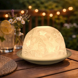 Estos atractivos Dome Lights están hechos de porcelana biscuit con muchos atractivos diseños. Objetos luminosos de porcelana blanca con motivos atractivos de la naturaleza, el arte, los temas modernos y otros motivos estacionales en relieve muy fino, que se iluminan con una vela de té o led muestran su encantador motivo.