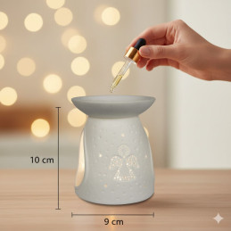 Ilumina tu hogar con calidez y armonía. Su diseño en porcelana calada con forma de estrella crea una atmósfera relajante mientras libera suaves aromas. Ideal con semiesferas de cera vegetal o aceites.